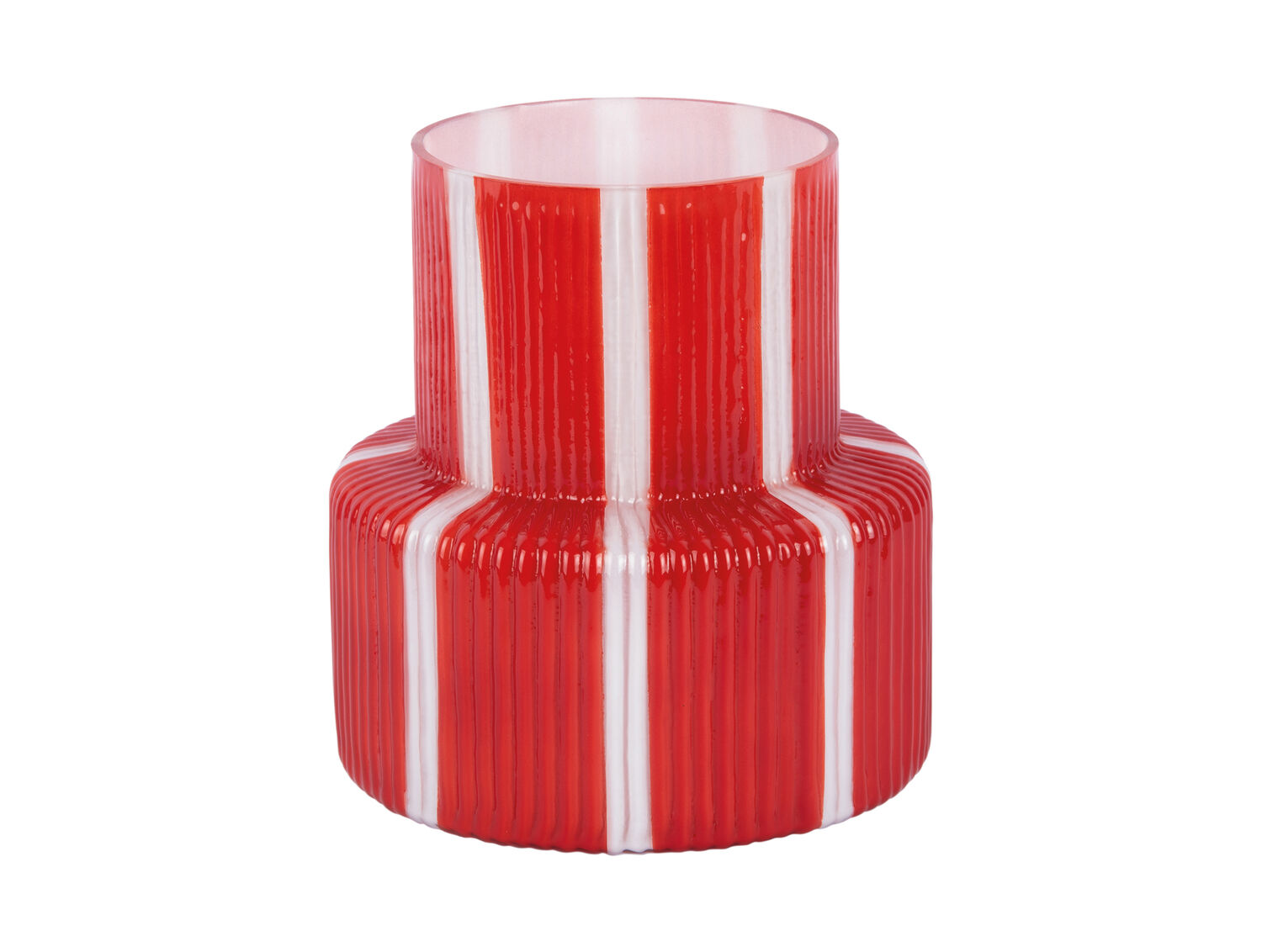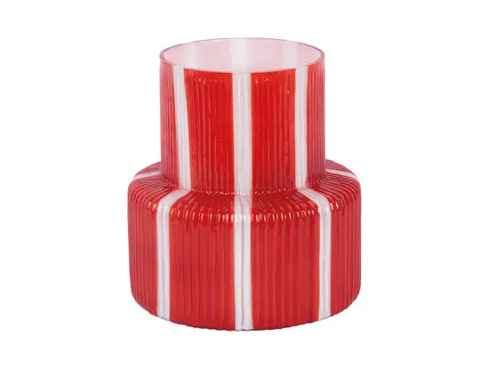 Glasmaterialet giver vasen et glat udtryk, der er nemt at vedligeholde - bare tør den af med en fugtig klud. Den skarlagenrøde farve med hvide striber skaber et visuelt fokuspunkt, der fungerer både med og uden blomster. Den brede base gør den stabil, mens den smallere top holder dine blomster på plads.