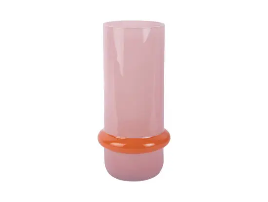 Denne vase fra Present Time har en cylindrisk form i blød lyserød med en markant orange ring omkring midten. Glassets glatte, reflekterende overflade giver et visuelt element til din indretning, mens farvekombinationen tilføjer et moderne touch til dit rum.