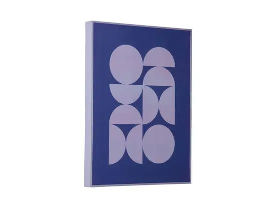 Geometrisk vægkunst i koboltblå, der tilføjer et moderne og iøjnefaldende element til din væg. Designet kombinerer cirkler og halvcirkler i et abstrakt mønster, monteret i en ramme og klar til ophængning. Lavet i MDF med dimensionerne 40 cm i højden og 30 cm i bredden.