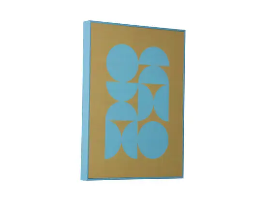 Den citrongule baggrund reflekterer lys og skaber en lysere atmosfære i dit rum. De geometriske former i lyseblå giver struktur uden at virke tunge. Med kun 3 cm i dybde sidder kunstværket tæt på væggen, så det også fungerer i smallere gange eller bag møbler. Rammen i lyseblå skaber en sammenhængende helhed.