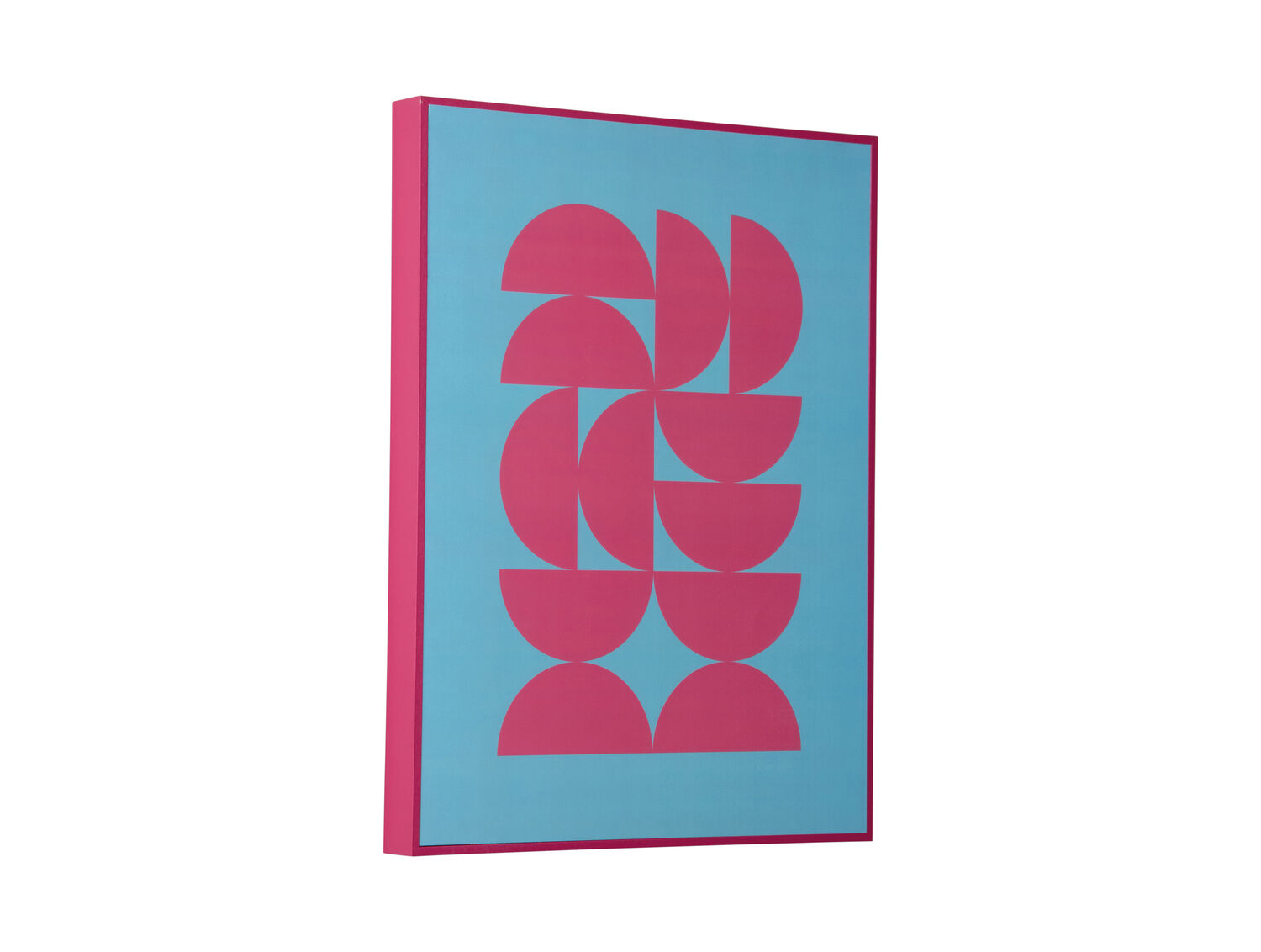 Dette vægkunstværk kombinerer lyserøde geometriske former med en blød blå baggrund, der skaber en beroligende stemning i rummet. MDF-materialet giver en stabil konstruktion, mens den pink ramme matcher de grafiske halvcirkler. Det måler 40 cm i højden og 30 cm i bredden.