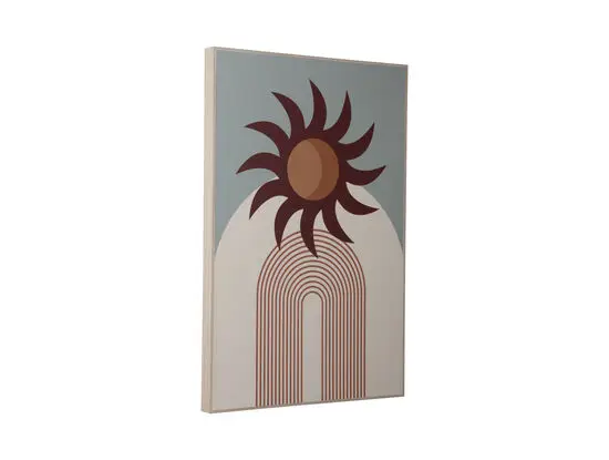 Den multicolor palette med blå og beige nuancer gør det nemt at matche kunstværket med den eksisterende indretning. Solmotivet med mørkebrun midte og sorte stråler skaber et fokuspunkt, mens de buede linjer tilføjer bevægelse. MDF-materialet sikrer en jævn overflade, der fremhæver farverne og designets detaljer.