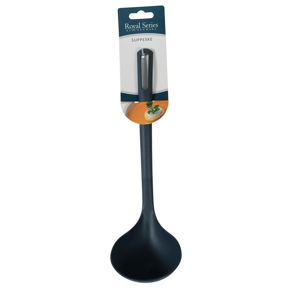 Denne 29 cm lange suppeske i PBT-plast er designet med særligt fokus på at beskytte dine gryder og pander. Den gråblå ske er skånsom mod non-stick belægninger, så du trygt kan øse din suppe uden bekymringer.