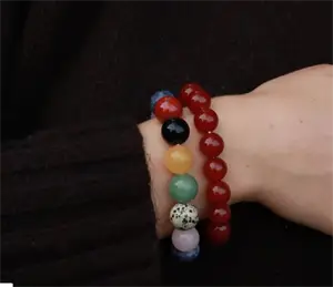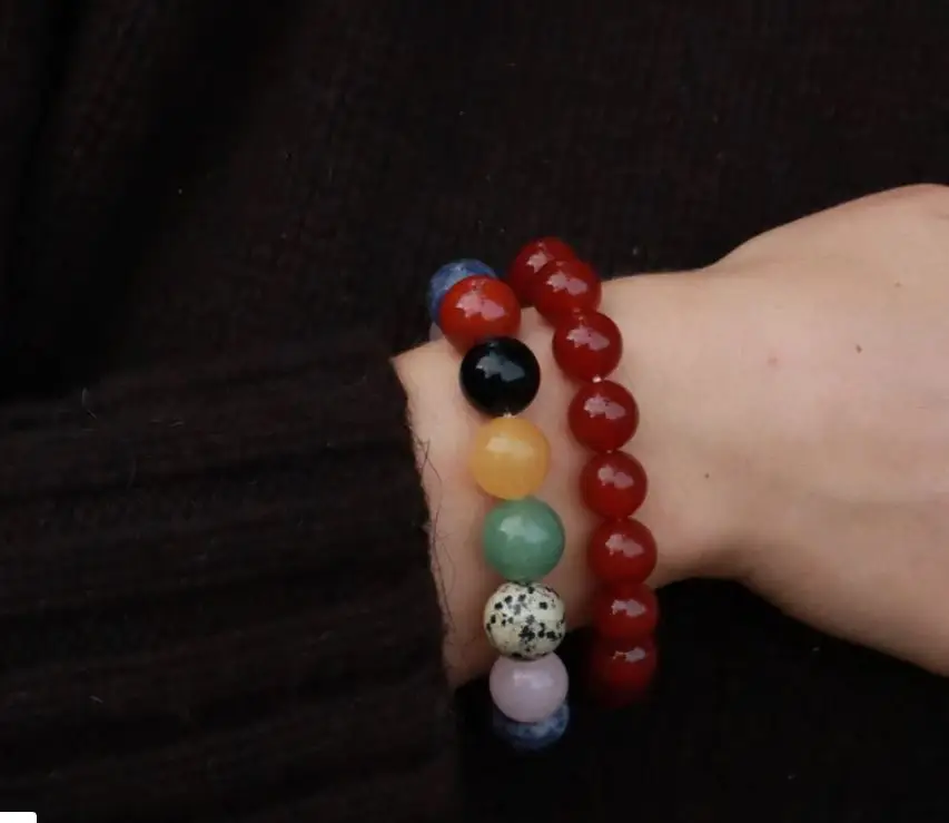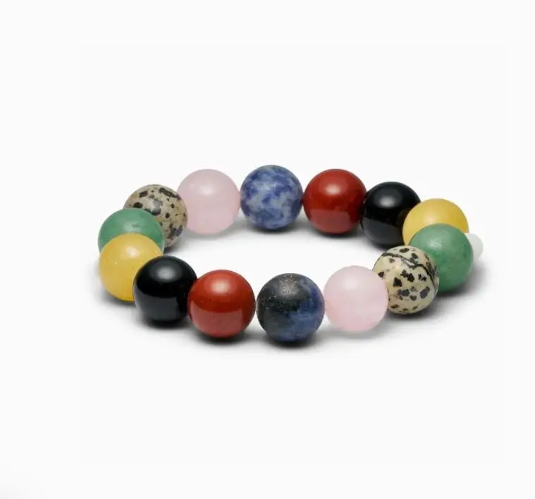 Farver og mønstre kan variere, da hver sten er naturlig og særpræget. Dette betyder, at dit armbånd får sit eget udtryk. Kombinationen af grøn aventurin, dalmatian jasper, rosenkvarts, blue point, rød jasper, black onyx og honey jade skaber en farverig palette, der passer til kreative individer.