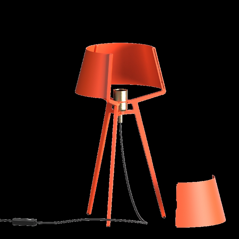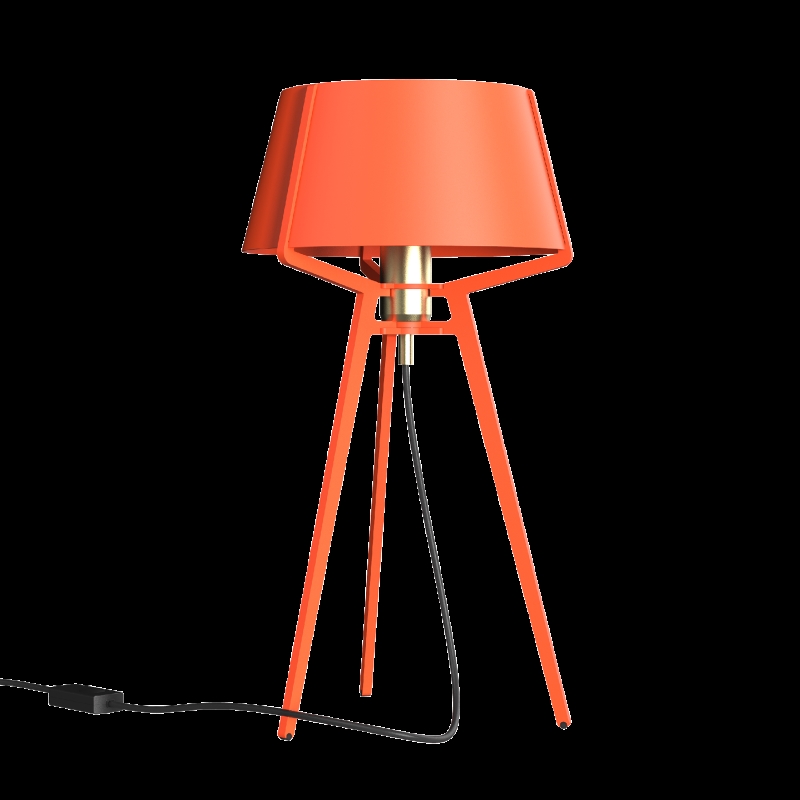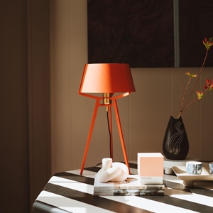 Denne bordlampe kombinerer en slående orange farve med messingdetaljer, hvilket giver den et markant udtryk. Den er fremstillet af pulverlakeret stål med en lukket skærm og tre ben, der sikrer stabilitet. Armaturet fastgøres med én skrue, hvilket gør monteringen ligetil.