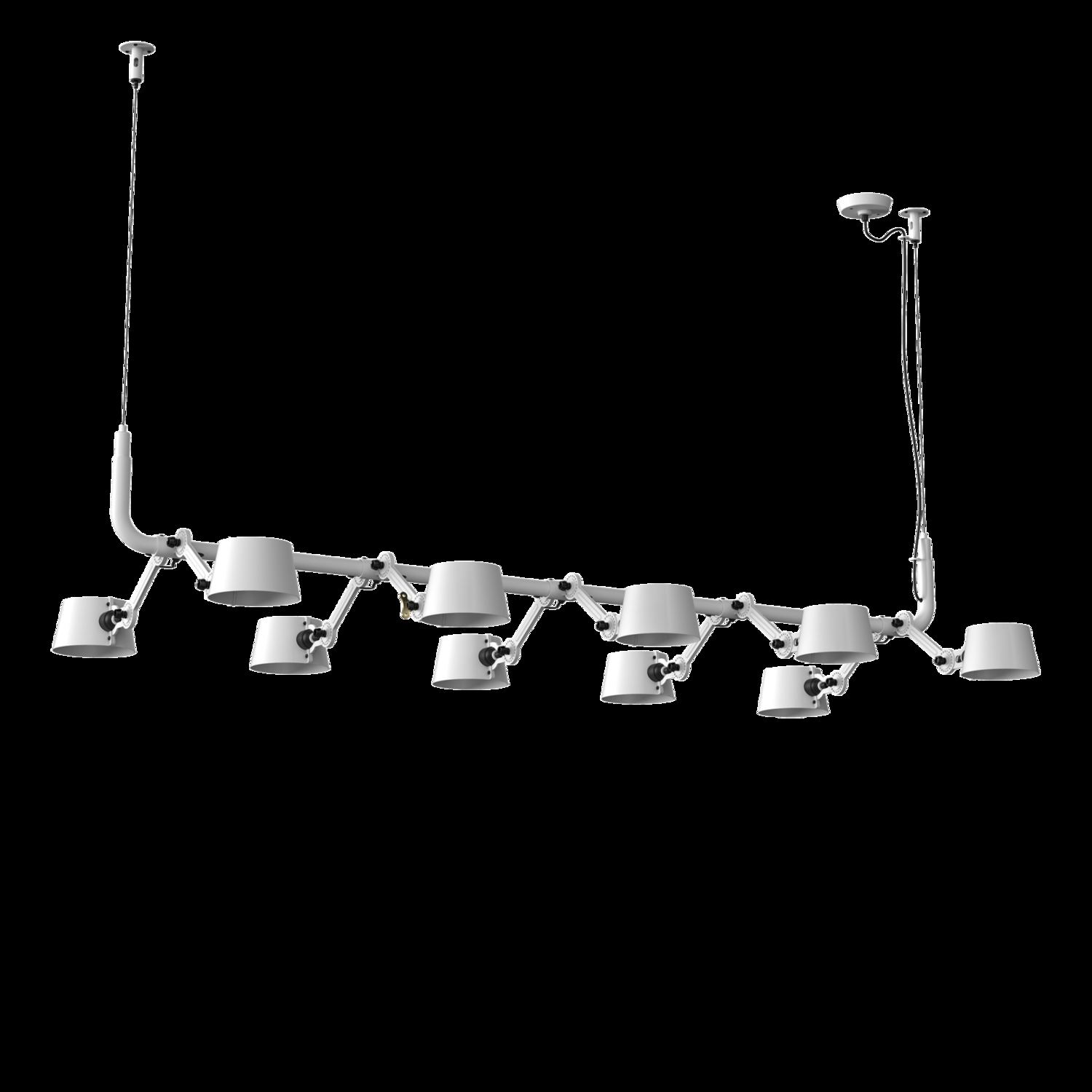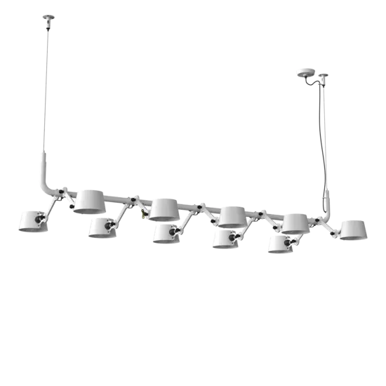 Tonone Bolt 10-pak pendel er et design af Anton de Groof. Den robuste industrielle lampeserie BOLT er genkendelig ved funktionalitet i form, rene linjer og vingemøtrikkens ikoniske hovedrolle. Bolt-serien fås i 29 modeller. 10-pak pendelen er kendetegnet ved en ramme med 10 justerbare pulverlakerede stålarme og pulverlakerede aluminiumsskærme. De åbne skærme sikrer en flot lysfordeling. Loftslampen kan justeres i forskellige positioner med vingemøtrikken. Den massive messingvingemøtrik er inkluderet for at justere hængslerne efter ønske. Udover at være et funktionelt hjælpemiddel er vingemøtrikken integreret i lampens design og er et karakteristisk visuelt element. Tonone Bolt-serien fås i 11 farver: Smokey Black, Flux Green, Pure White, Ash Grey, Midnight Grey, Lightning White, Striking Orange, Thunder Blue, Daybreak Rose, Sunny Yellow og Ice Blue. Bolt Pack-pendlen fås også i en 6-, 8- eller 12-pak.