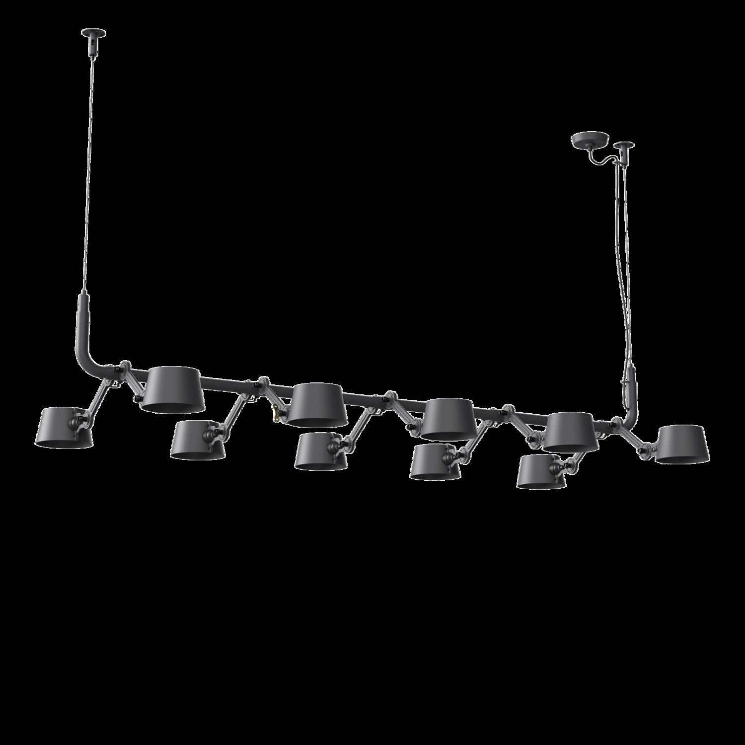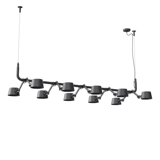 Tonone Bolt 10-pak pendel er et design af Anton de Groof. Den robuste industrielle lampeserie BOLT er genkendelig ved funktionalitet i form, rene linjer og vingemøtrikkens ikoniske hovedrolle. Bolt-serien fås i 29 modeller. 10-pak pendelen er kendetegnet ved en ramme med 10 justerbare pulverlakerede stålarme og pulverlakerede aluminiumsskærme. De åbne skærme sikrer en flot lysfordeling. Loftslampen kan justeres i forskellige positioner med vingemøtrikken. Den massive messingvingemøtrik er inkluderet for at justere hængslerne efter ønske. Udover at være et funktionelt hjælpemiddel er vingemøtrikken integreret i lampens design og er et karakteristisk visuelt element. Tonone Bolt-serien fås i 11 farver: Smokey Black, Flux Green, Pure White, Ash Grey, Midnight Grey, Lightning White, Striking Orange, Thunder Blue, Daybreak Rose, Sunny Yellow og Ice Blue. Bolt Pack-pendlen fås også i en 6-, 8- eller 12-pak.