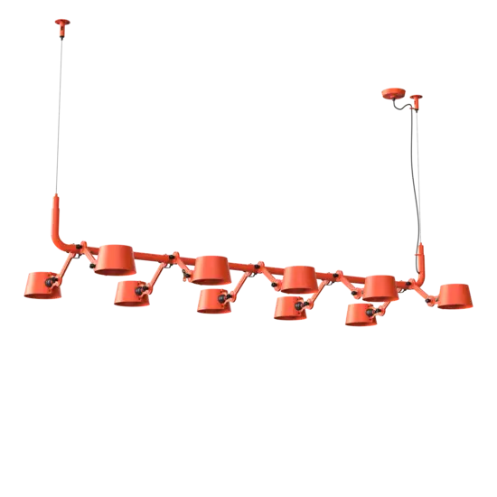Tonone Bolt 10-pak pendel er et design af Anton de Groof. Den robuste industrielle lampeserie BOLT er genkendelig ved funktionalitet i form, rene linjer og vingemøtrikkens ikoniske hovedrolle. Bolt-serien fås i 29 modeller. 10-pak pendelen er kendetegnet ved en ramme med 10 justerbare pulverlakerede stålarme og pulverlakerede aluminiumsskærme. De åbne skærme sikrer en flot lysfordeling. Loftslampen kan justeres i forskellige positioner med vingemøtrikken. Den massive messingvingemøtrik er inkluderet for at justere hængslerne efter ønske. Udover at være et funktionelt hjælpemiddel er vingemøtrikken integreret i lampens design og er et karakteristisk visuelt element. Tonone Bolt-serien fås i 11 farver: Smokey Black, Flux Green, Pure White, Ash Grey, Midnight Grey, Lightning White, Striking Orange, Thunder Blue, Daybreak Rose, Sunny Yellow og Ice Blue. Bolt Pack-pendlen fås også i en 6-, 8- eller 12-pak.