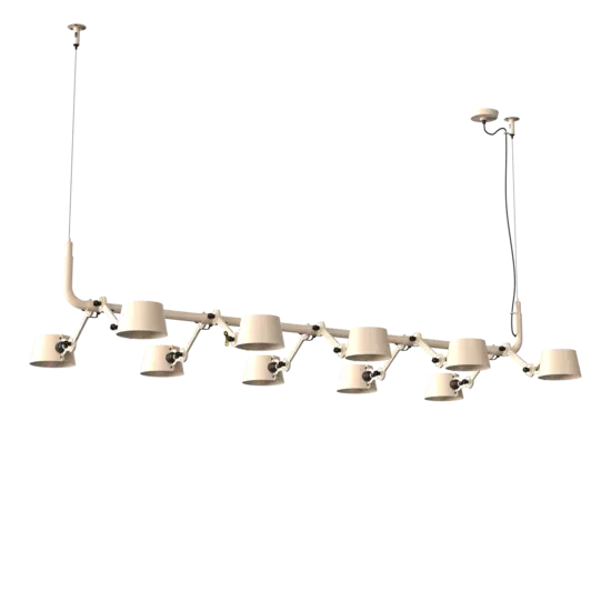 Tonone Bolt 10-pak pendel er et design af Anton de Groof. Den robuste industrielle lampeserie BOLT er genkendelig ved funktionalitet i form, rene linjer og vingemøtrikkens ikoniske hovedrolle. Bolt-serien fås i 29 modeller. 10-pak pendelen er kendetegnet ved en ramme med 10 justerbare pulverlakerede stålarme og pulverlakerede aluminiumsskærme. De åbne skærme sikrer en flot lysfordeling. Loftslampen kan justeres i forskellige positioner med vingemøtrikken. Den massive messingvingemøtrik er inkluderet for at justere hængslerne efter ønske. Udover at være et funktionelt hjælpemiddel er vingemøtrikken integreret i lampens design og er et karakteristisk visuelt element. Tonone Bolt-serien fås i 11 farver: Smokey Black, Flux Green, Pure White, Ash Grey, Midnight Grey, Lightning White, Striking Orange, Thunder Blue, Daybreak Rose, Sunny Yellow og Ice Blue. Bolt Pack-pendlen fås også i en 6-, 8- eller 12-pak.