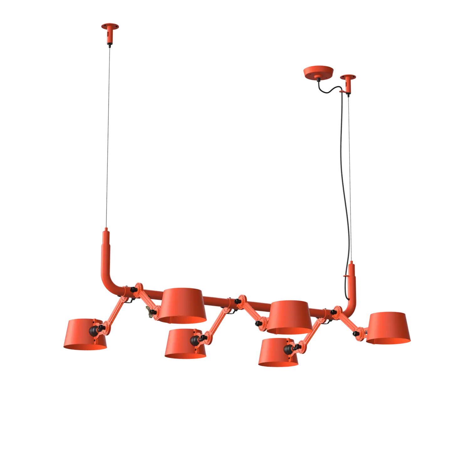 Tonone Bolt 6-Pack Pendel er et design af Anton de Groof. Den robuste industrielle lampeserie BOLT er genkendelig ved funktionalitet i form, rene linjer og vingemøtrikkens ikoniske hovedrolle. Bolt-serien fås i 29 modeller. 6-Pack Pendelen er kendetegnet ved en ramme med 6 justerbare pulverlakerede stålarme og pulverlakerede aluminiumsskærme. De åbne skærme sikrer en flot lysfordeling. Loftslampen kan justeres i forskellige positioner med vingemøtrikken. Den massive messingvingemøtrik er inkluderet for at justere hængslerne efter ønske. Udover at være et funktionelt hjælpemiddel er vingemøtrikken integreret i lampens design og er et karakteristisk visuelt element. Tonone Bolt-serien fås i 11 farver: Smokey Black, Flux Green, Pure White, Ash Grey, Midnight Grey, Lightning White, Striking Orange, Thunder Blue, Daybreak Rose, Sunny Yellow og Ice Blue. Bolt Pack-Pendlen fås også i en 8-, 10- eller 12-pak.