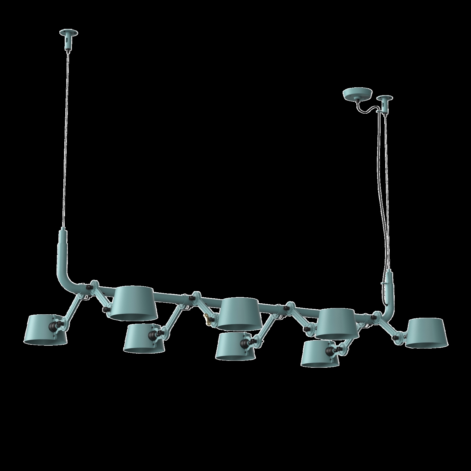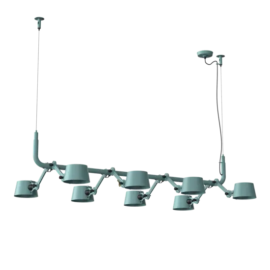 Tonone Bolt 8-pak pendel er et design af Anton de Groof. Den robuste industrielle lampeserie BOLT er genkendelig ved funktionalitet i form, rene linjer og vingemøtrikkens ikoniske hovedrolle. Bolt-serien fås i 29 modeller. 8-pak pendelen er kendetegnet ved en ramme med 8 justerbare pulverlakerede stålarme og pulverlakerede aluminiumsskærme. De åbne skærme sikrer en flot lysfordeling. Loftslampen kan justeres i forskellige positioner med vingemøtrikken. Den massive messingvingemøtrik er inkluderet for at justere hængslerne efter ønske. Udover at være et funktionelt hjælpemiddel er vingemøtrikken integreret i lampens design og er et karakteristisk visuelt element. Tonone Bolt-serien fås i 11 farver: Smokey Black, Flux Green, Pure White, Ash Grey, Midnight Grey, Lightning White, Striking Orange, Thunder Blue, Daybreak Rose, Sunny Yellow og Ice Blue. Bolt Pack-pendlen fås også i en 6-, 10- eller 12-pak.