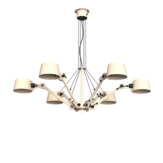 Denne lysekrone fra Tonone kombinerer industrielt design med praktisk funktionalitet. De seks pulverlakerede stålarme kan justeres individuelt, så du kan rette lyset præcis derhen, hvor du har brug for det. Skærmene er lavet af pulverlakeret aluminium og sikrer en jævn lysfordeling i rummet.