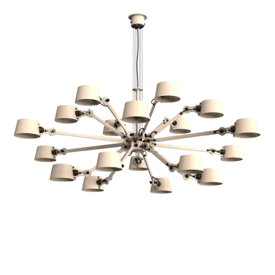 Denne lysekrone fra Tonone har 18 justerbare arme, der giver dig fuld kontrol over lysretningen i rummet. De åbne skærme sikrer en flot lysfordeling, så lyset spredes jævnt og skaber den atmosfære, du ønsker. Armene er lavet af pulverlakeret stål, hvilket giver holdbarhed og et moderne udtryk.