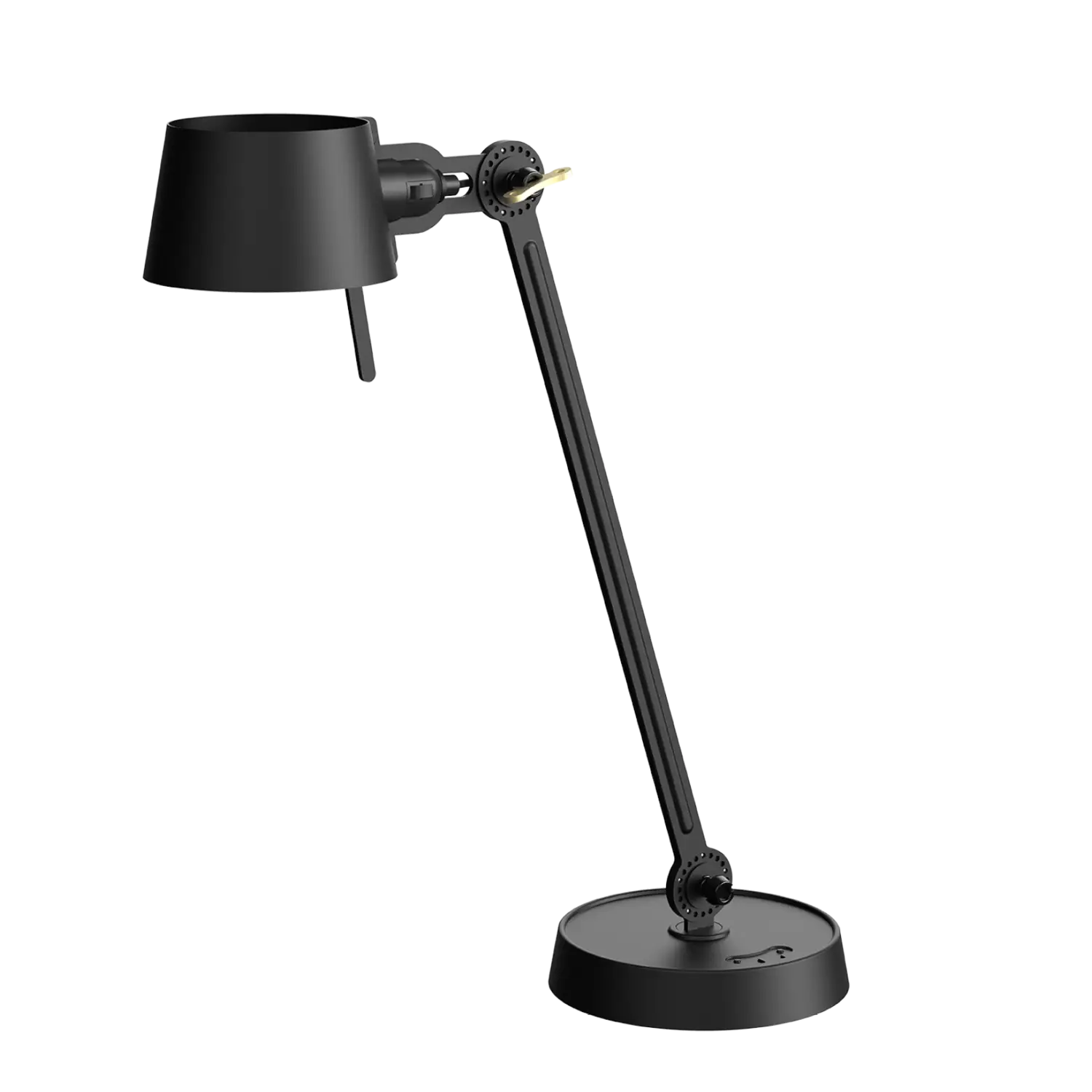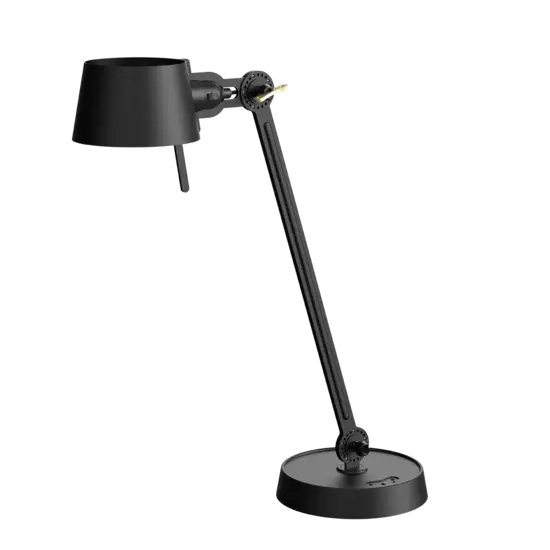 Tonone Bolt Desk 1 arm foot er et design af Anton de Groof. Den robuste industrielle lampeserie BOLT er genkendelig ved funktionalitet i form, rene linjer og vingemøtrikkens ikoniske hovedrolle. Bolt-serien fås i 29 modeller. Skrivebordslampen er kendetegnet ved en justerbar pulverlakeret stålarm og en åben skærm lavet af pulverlakeret aluminium. Den åbne skærm sikrer en flot lysfordeling. Den massive messingvingemøtrik er inkluderet for at justere hængslerne efter ønske. Udover at være et funktionelt hjælpemiddel er vingemøtrikken integreret i lampens design og er et karakteristisk visuelt element. Lampen kan drejes og har en tung fod. Skrivebordslampen fås også med klemme. Tonone Bolt-serien i 11 farver: Smokey Black, Flux Green, Pure White, Ash Grey, Midnight Grey, Lightning White, Striking Orange, Thunder Blue, Daybreak Rose, Sunny Yellow og Ice Blue.