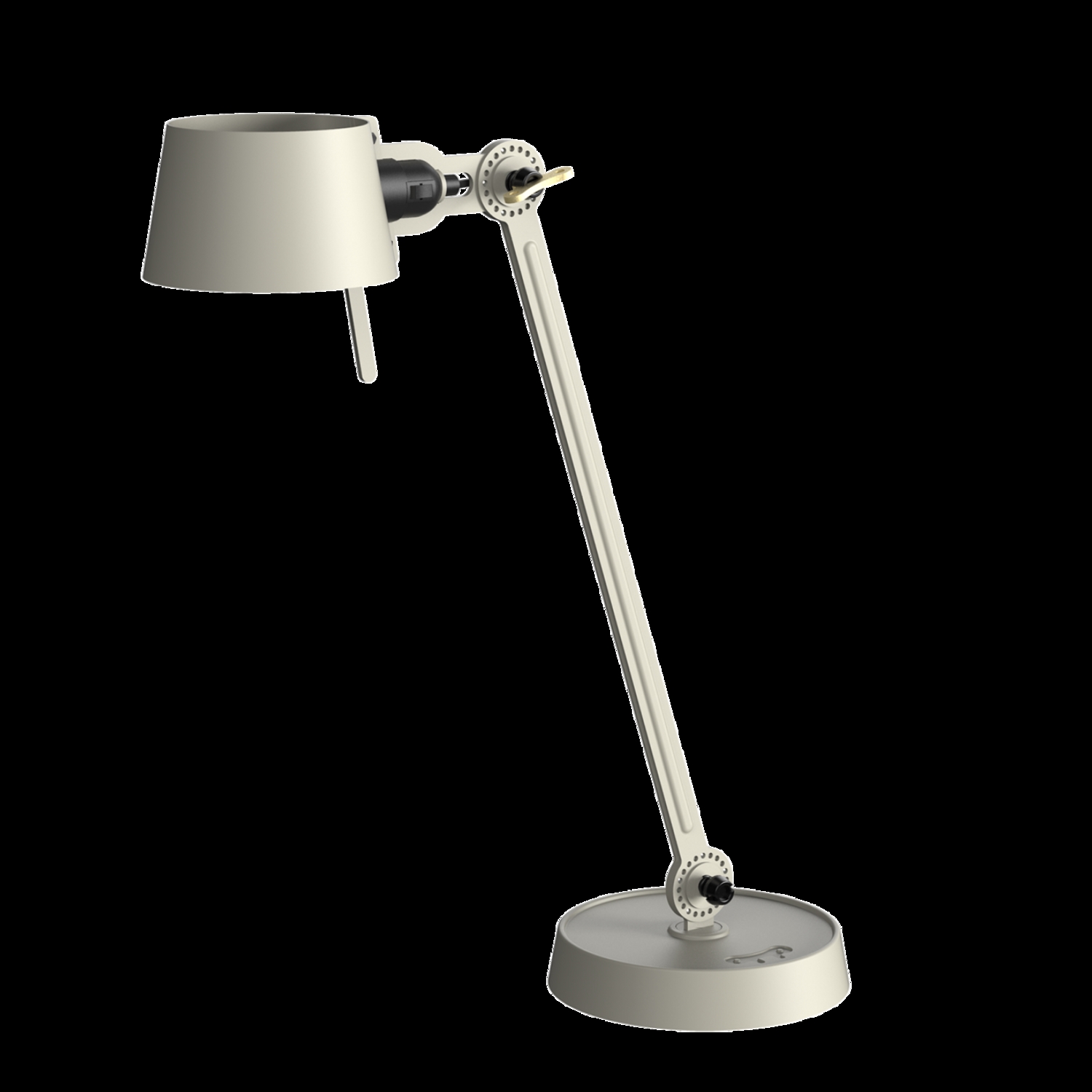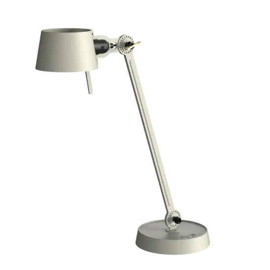 Tonone Bolt Desk 1 arm foot er et design af Anton de Groof. Den robuste industrielle lampeserie BOLT er genkendelig ved funktionalitet i form, rene linjer og vingemøtrikkens ikoniske hovedrolle. Bolt-serien fås i 29 modeller. Skrivebordslampen er kendetegnet ved en justerbar pulverlakeret stålarm og en åben skærm lavet af pulverlakeret aluminium. Den åbne skærm sikrer en flot lysfordeling. Den massive messingvingemøtrik er inkluderet for at justere hængslerne efter ønske. Udover at være et funktionelt hjælpemiddel er vingemøtrikken integreret i lampens design og er et karakteristisk visuelt element. Lampen kan drejes og har en tung fod. Skrivebordslampen fås også med klemme. Tonone Bolt-serien i 11 farver: Smokey Black, Flux Green, Pure White, Ash Grey, Midnight Grey, Lightning White, Striking Orange, Thunder Blue, Daybreak Rose, Sunny Yellow og Ice Blue.