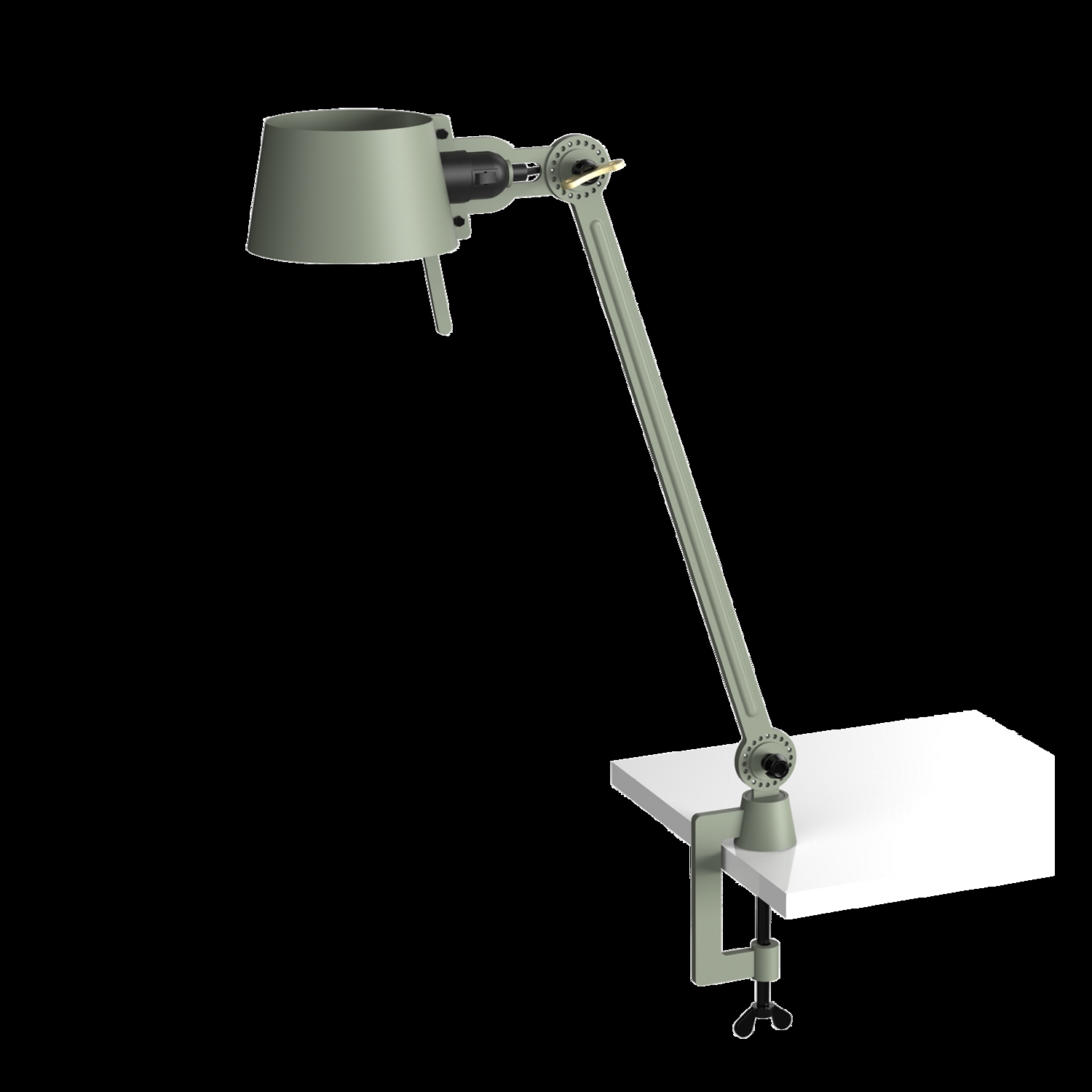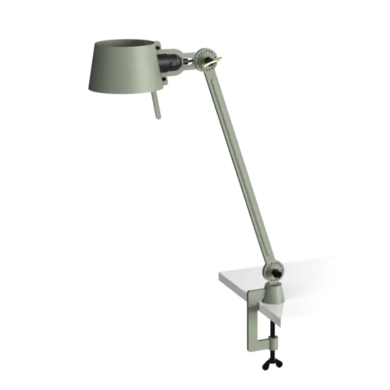 Tonone Bolt Desk 1 armklemme er et design af Anton de Groof. Den robuste industrielle lampeserie BOLT er genkendelig ved funktionalitet i form, rene linjer og vingemøtrikkens ikoniske hovedrolle. Bolt-serien fås i 29 modeller. Skrivebordslampen er kendetegnet ved en justerbar pulverlakeret stålarm og en åben skærm lavet af pulverlakeret aluminium. Den åbne skærm sikrer en flot lysfordeling. Den massive messingvingemøtrik er inkluderet til at justere hængslerne efter ønske. Udover at være et funktionelt hjælpemiddel er vingemøtrikken integreret i lampens design og er et karakteristisk visuelt element. Lampen kan drejes og har en klemme til at fastgøre lampen til et skrivebord eller bord. Skrivebordslampen fås også med fod. Tonone Bolt-serien i 11 farver: Smokey Black, Flux Green, Pure White, Ash Grey, Midnight Grey, Lightning White, Striking Orange, Thunder Blue, Daybreak Rose, Sunny Yellow og Ice Blue.