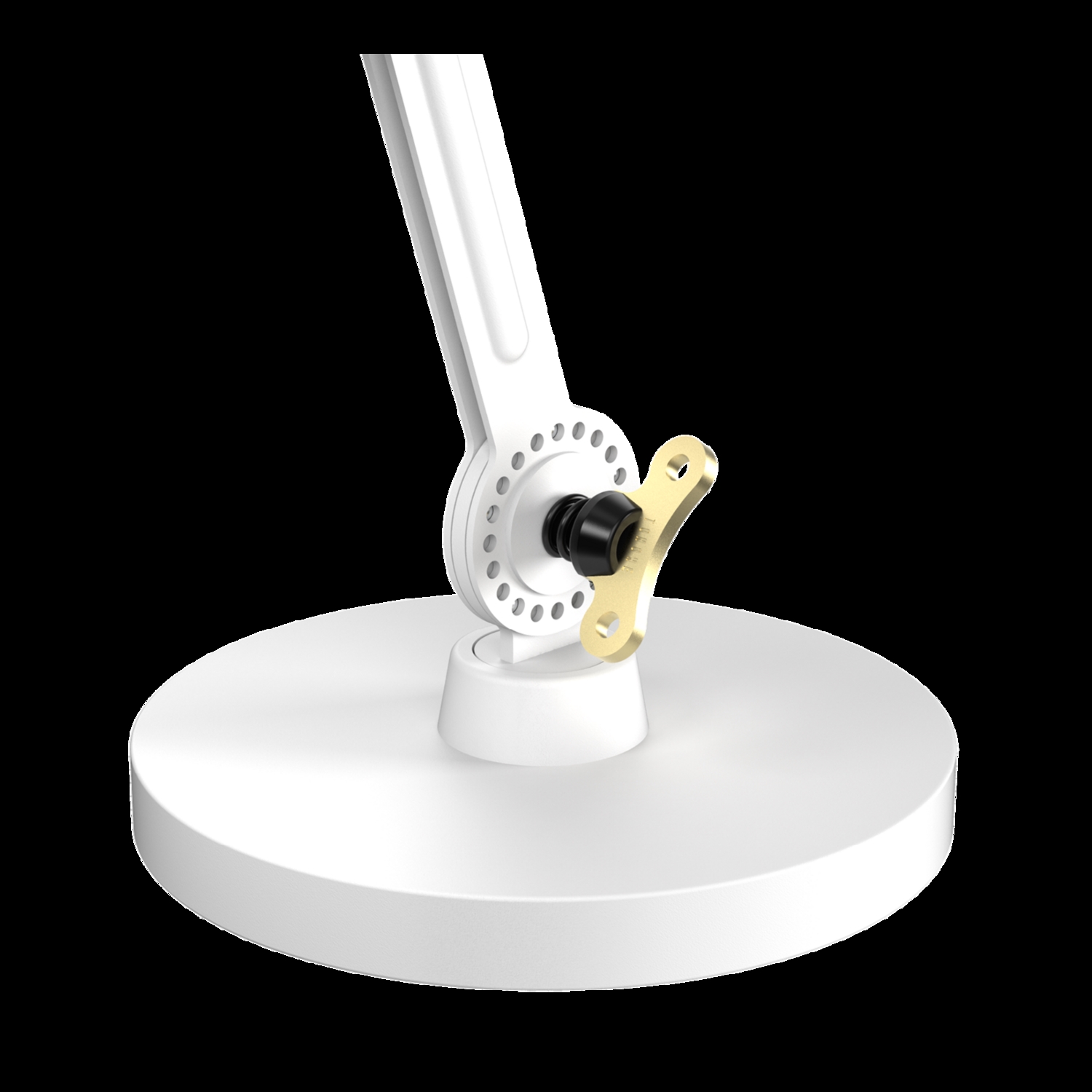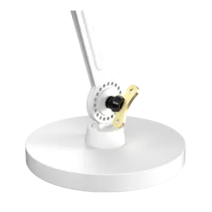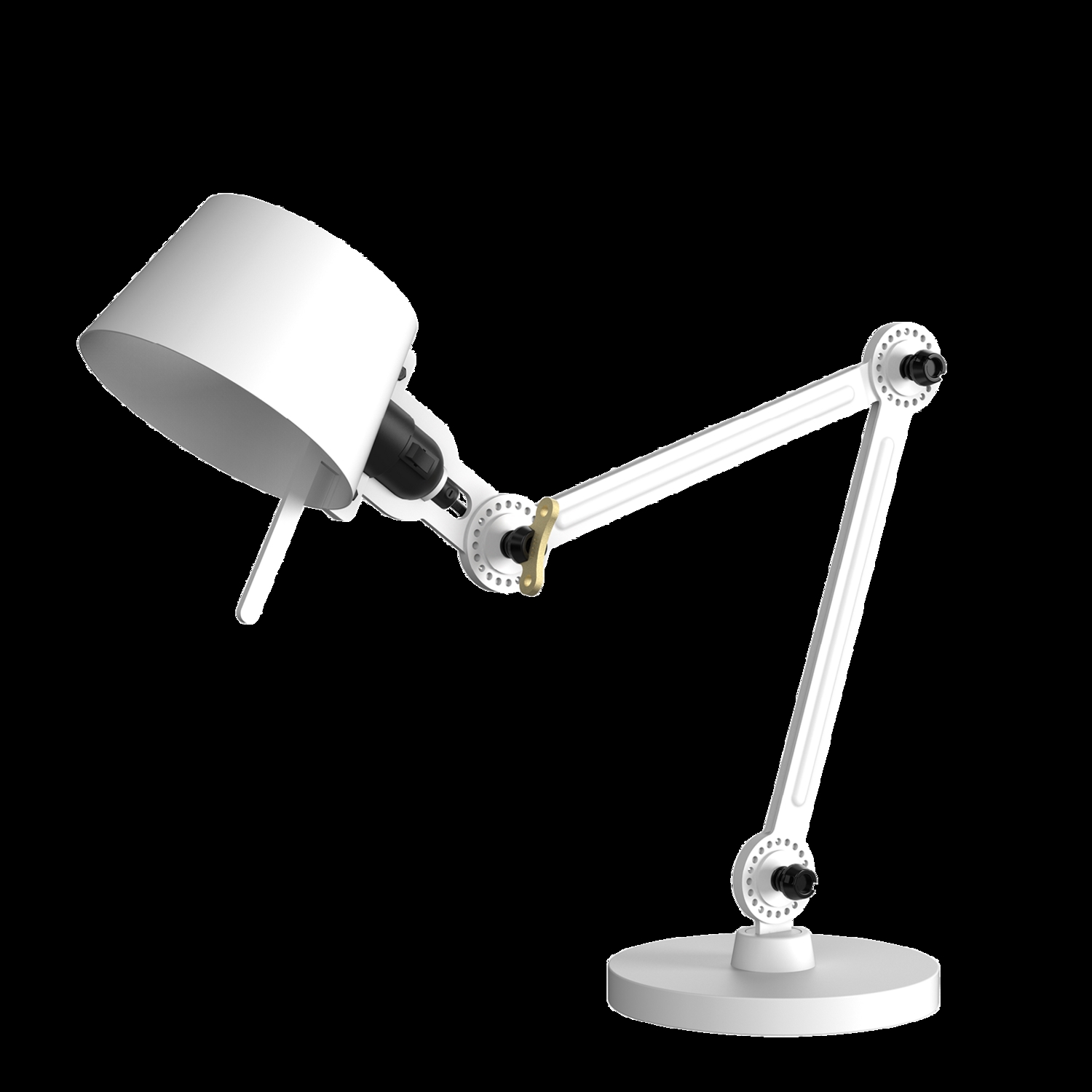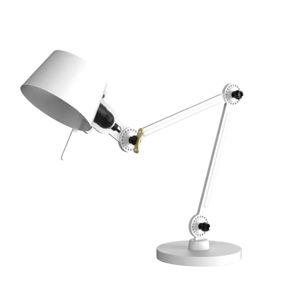 Tonone Bolt Desk Small 2-arms fod er et design af Anton de Groof. Den robuste industrielle lampeserie BOLT er genkendelig ved funktionalitet i form, rene linjer og vingemøtrikkens ikoniske hovedrolle. Bolt-serien fås i 29 modeller. Skrivebordslampen er kendetegnet ved de to justerbare pulverlakerede stålarme og en åben skærm lavet af pulverlakeret aluminium. Den åbne skærm sikrer en flot lysfordeling. Den massive vingemøtrik i messing er inkluderet for at justere hængslerne efter ønske. Udover at være et funktionelt hjælpemiddel er vingemøtrikken integreret i lampens design og er et karakteristisk visuelt element. Lampen kan drejes og har en fod. Skrivebordslampen fås også med klemme. Tonone Bolt-serien i 11 farver: Smokey Black, Flux Green, Pure White, Ash Grey, Midnight Grey, Lightning White, Striking Orange, Thunder Blue, Daybreak Rose, Sunny Yellow og Ice Blue.