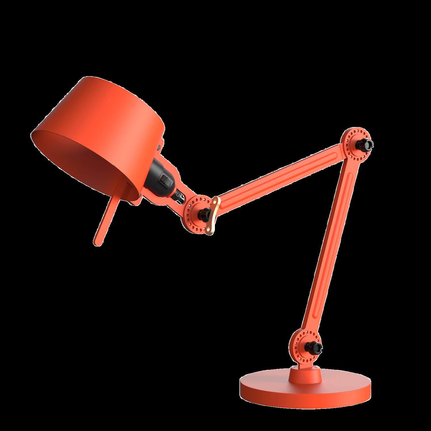 Tonone Bolt Desk Small 2-arms fod er et design af Anton de Groof. Den robuste industrielle lampeserie BOLT er genkendelig ved funktionalitet i form, rene linjer og vingemøtrikkens ikoniske hovedrolle. Bolt-serien fås i 29 modeller. Skrivebordslampen er kendetegnet ved de to justerbare pulverlakerede stålarme og en åben skærm lavet af pulverlakeret aluminium. Den åbne skærm sikrer en flot lysfordeling. Den massive messingvingemøtrik er inkluderet for at justere hængslerne efter ønske. Udover at være et funktionelt hjælpemiddel er vingemøtrikken integreret i lampens design og er et karakteristisk visuelt element. Lampen kan drejes og har en fod. Skrivebordslampen fås også med klemme. Tonone Bolt-serien i 11 farver: Smokey Black, Flux Green, Pure White, Ash Grey, Midnight Grey, Lightning White, Striking Orange, Thunder Blue, Daybreak Rose, Sunny Yellow og Ice Blue.