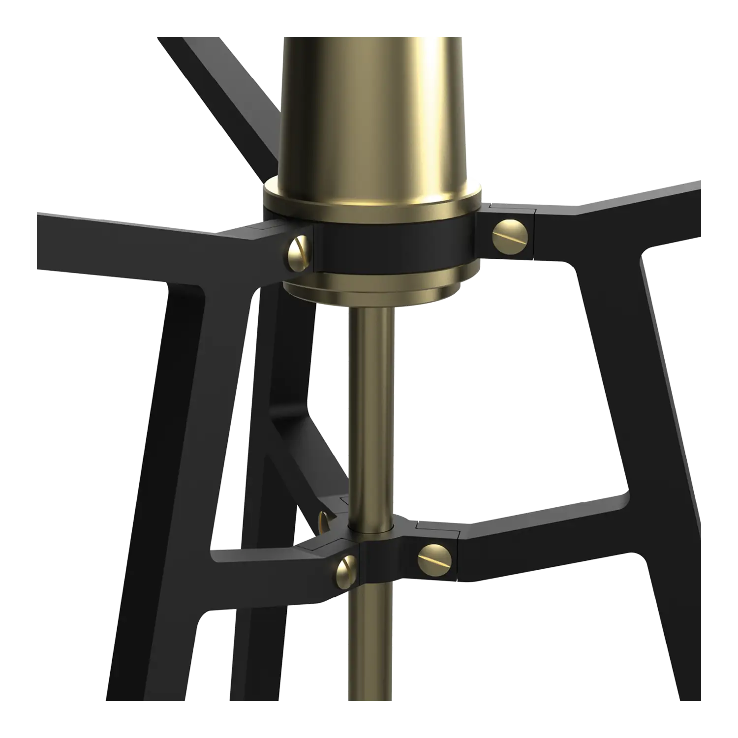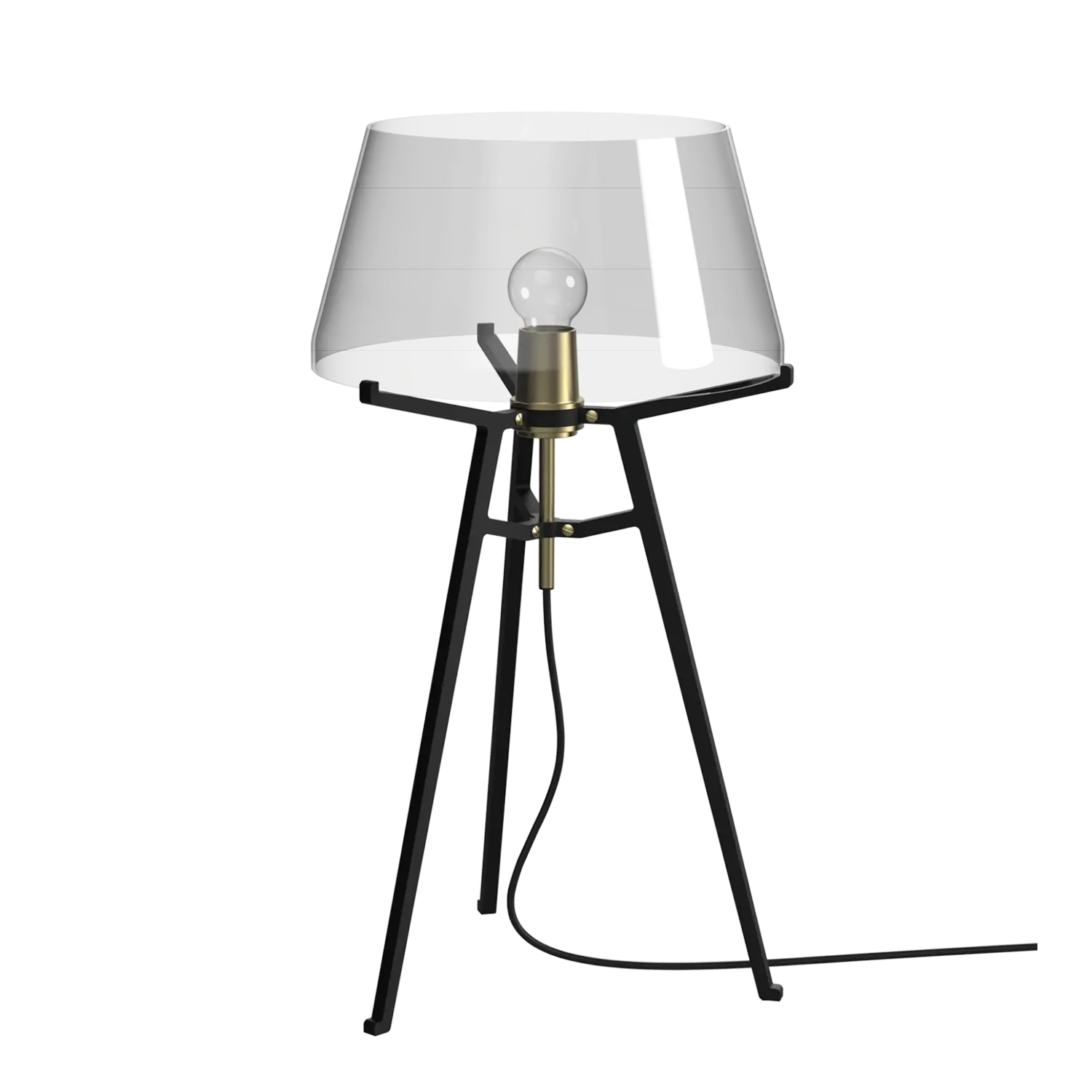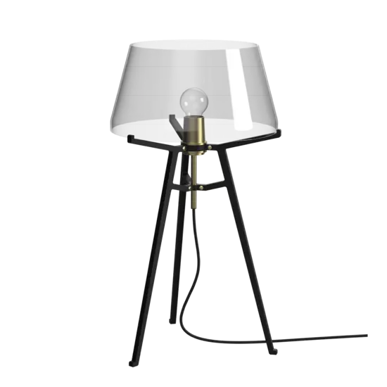 Den mundblæste glasskærm fra Ella sidder på en robust stålbase, der understreger lampens stærke, grafiske, men elegante og lette udseende. Både glassets transparente og neutrale grå toner giver en blød glød og harmonerer harmonisk med den sorte eller hvide base og messingdetaljerne.