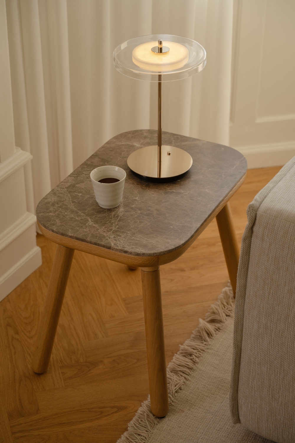 Det indbyggede LED-panel med hvid diffusor skaber en behagelig belysning. Bordlampen har 3 lysintensiteter, der justeres via knap på bordlampen. Batteriet kan holde op til 35 timer, og du kan nemt oplade batteriet med det medfølgende USB-kabel eller via Qi-opladningsenheden Unifier (tilkøbes separat).